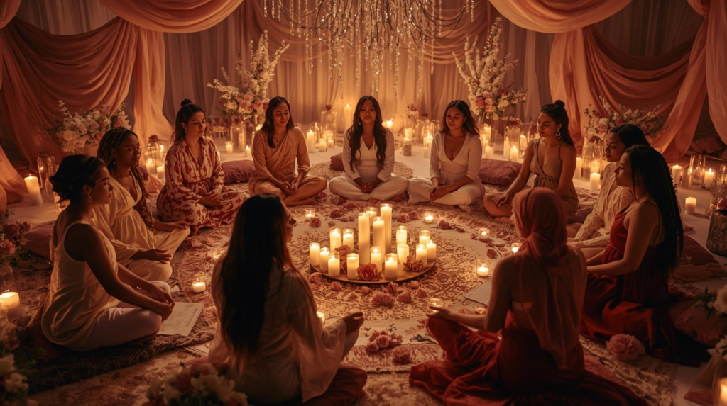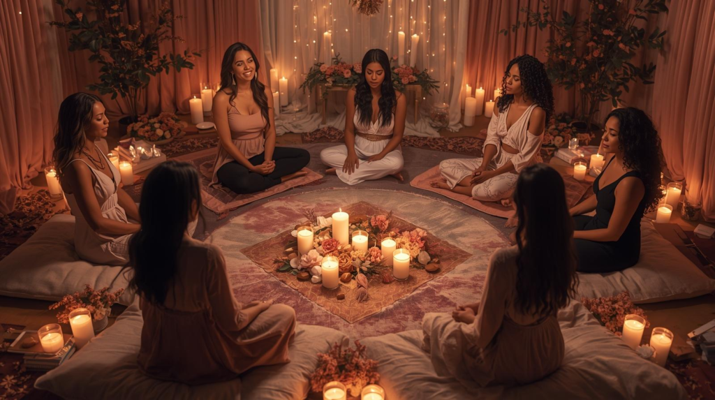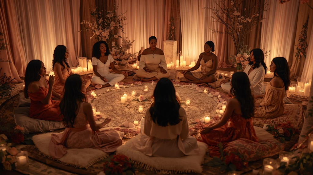 Monthly gatherings where women reconnect with the sacred feminine, release shame, and reclaim pleasure, joy, and creative power through community support and guided ritual.